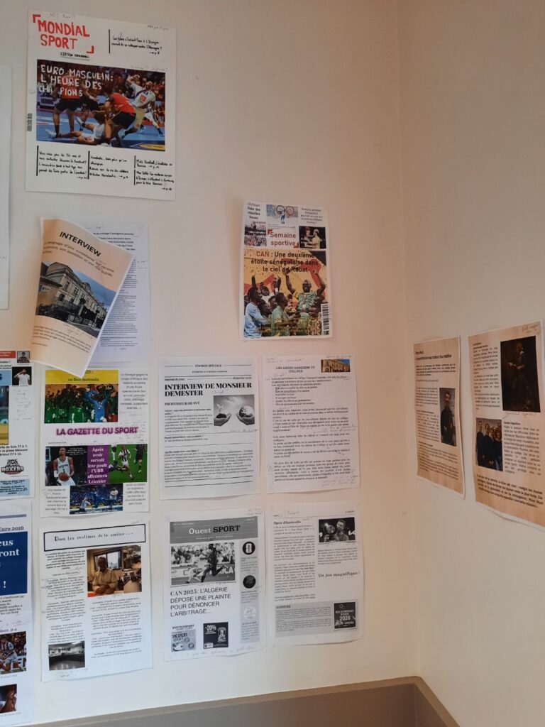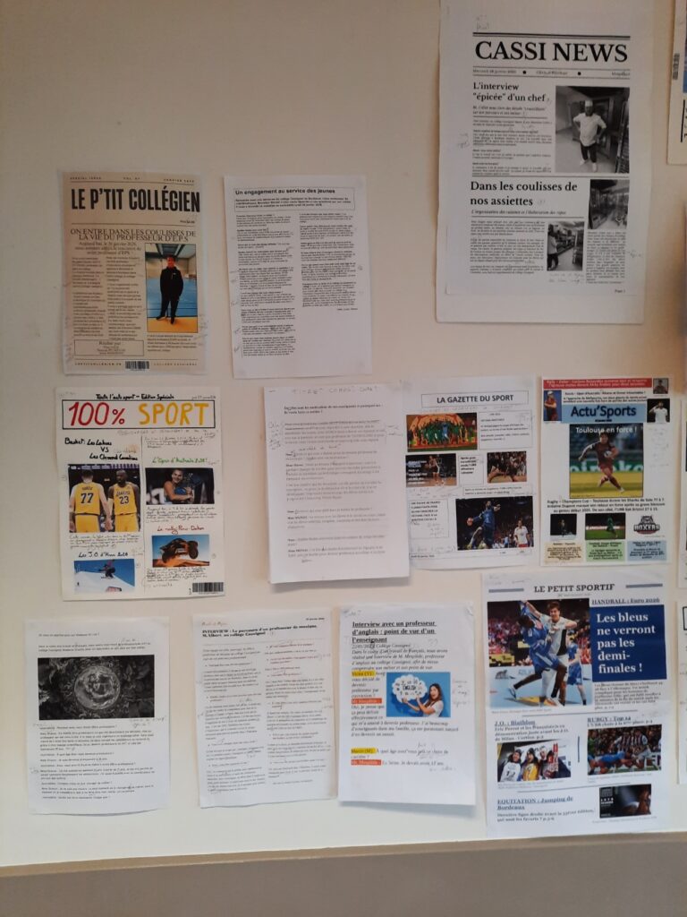 Certains élèves ont interviewé des adultes du collège (enseignants, personnels de Direction, agents, AED…) pour des entretiens exclusifs et formateurs ! D’autres ont préféré réaliser leur « Une » sportive du moment. N’hésitez pas à venir lire les travaux de nos « journalistes en herbe« , affichés en salle 208 !