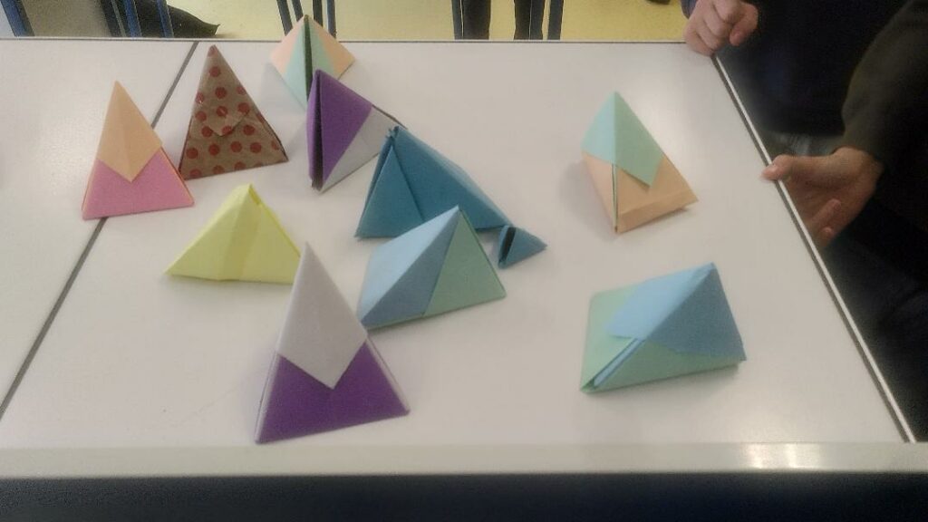 – fabrication de boîtes pyramidales à base de papier déjà utilisé (type feuilles de brouillon ou papier d’emballage cadeau) ;